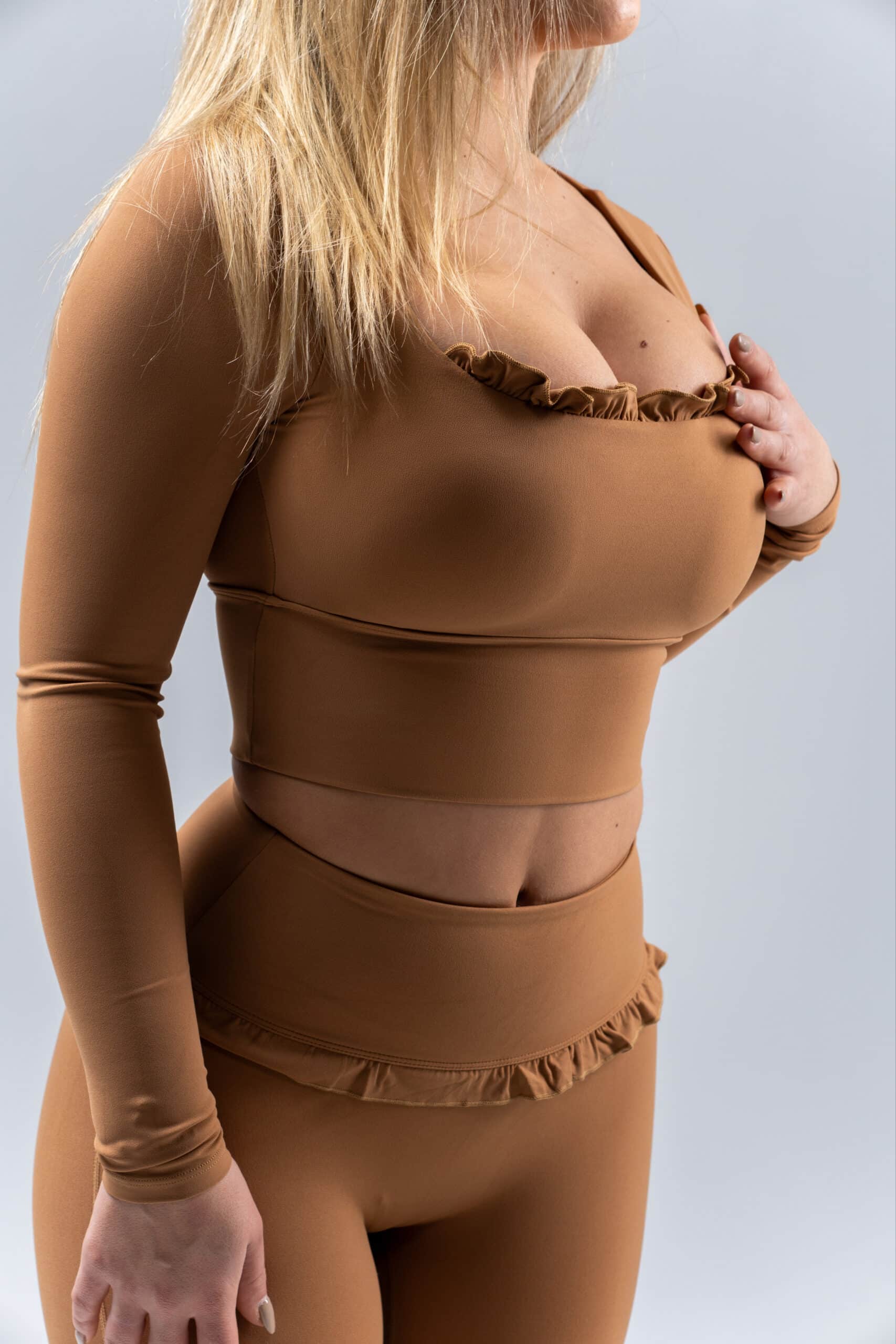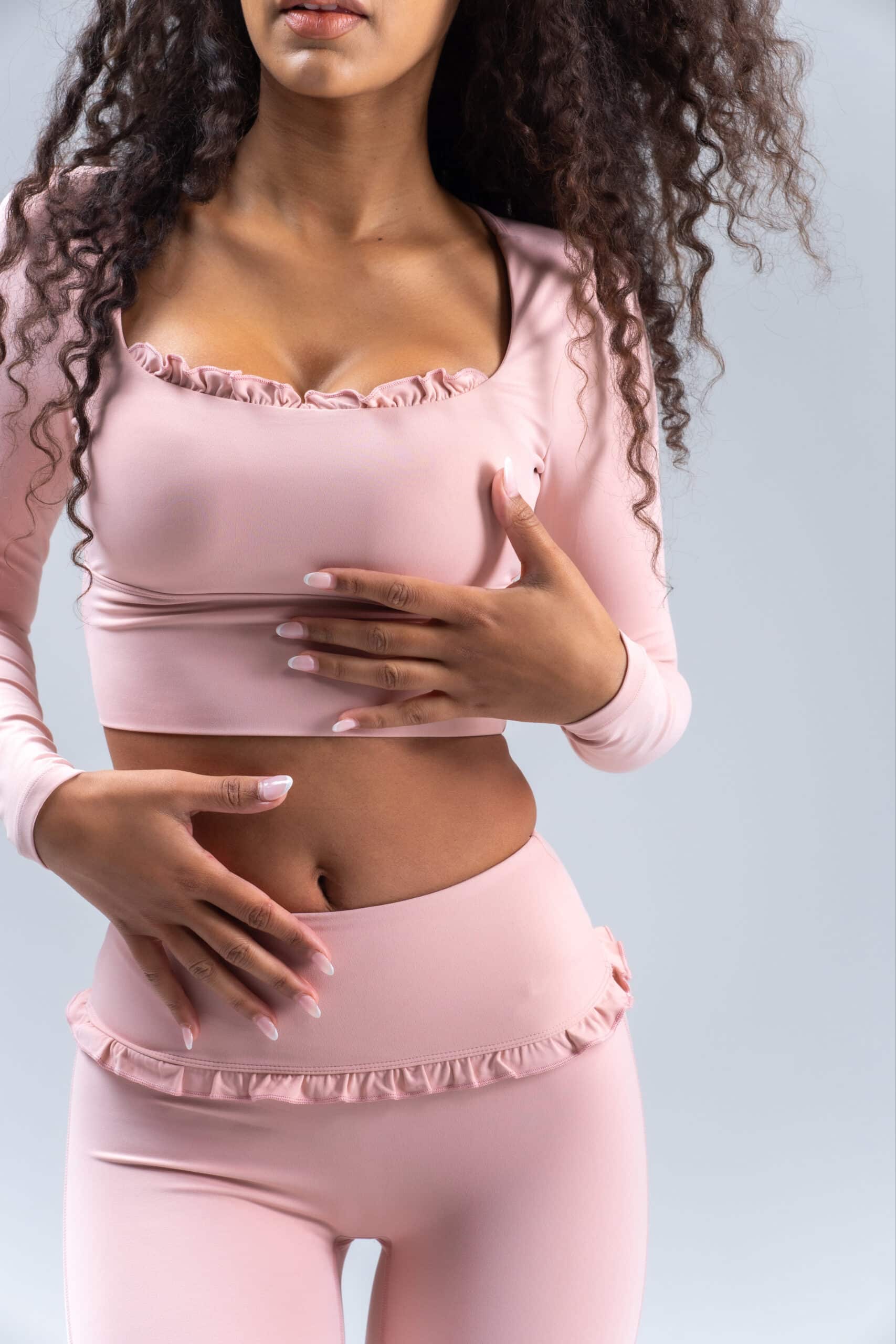Inspired by the graceful movements of ballet, the Ballerina long sleeve top brings a soft elegance to performance wear, designed with a delicate ruffle neckline. Wheter you are warming up, flowing through barre routine, or styling it as an athleisure fashion piece, this top blends shophistication with comfort for a truly elevated feel.