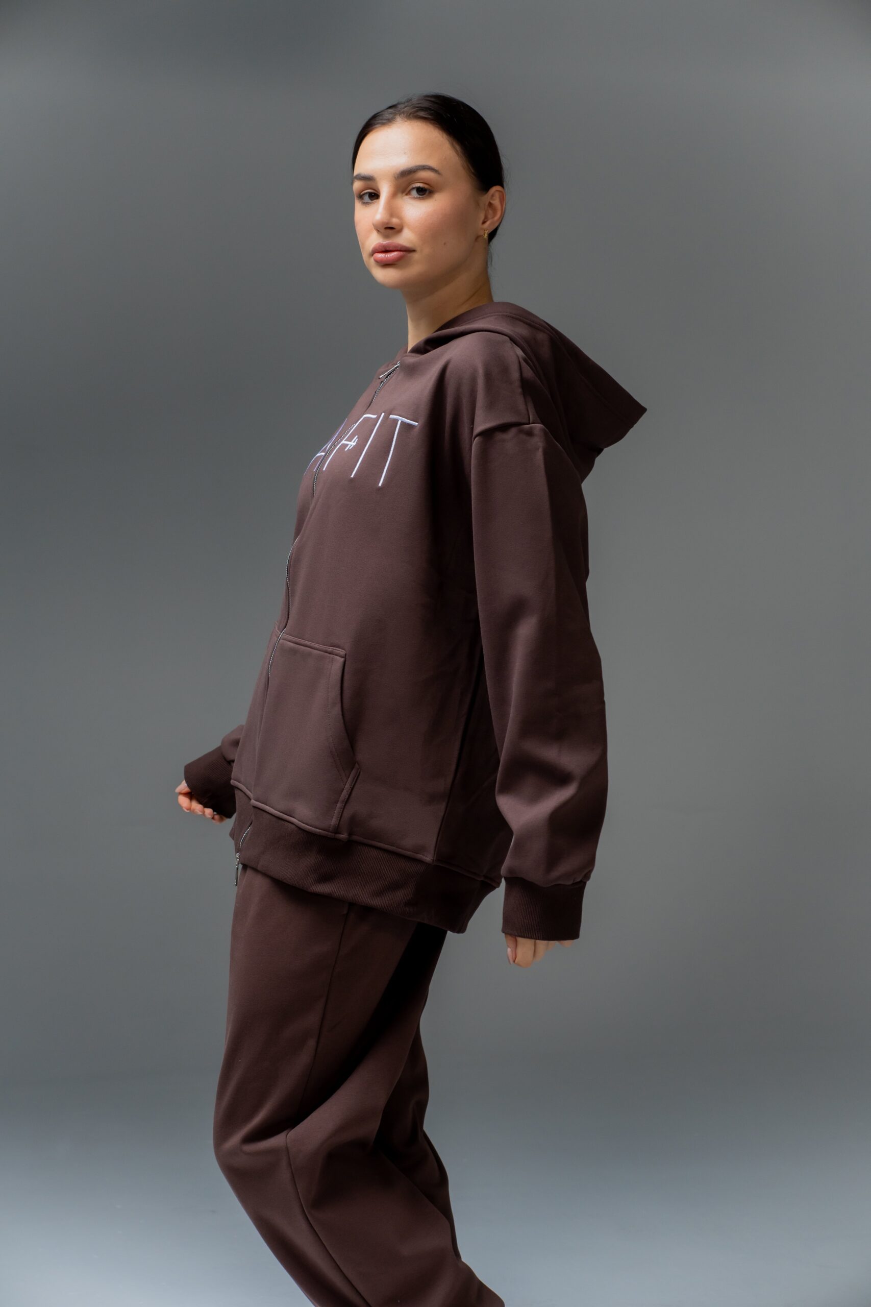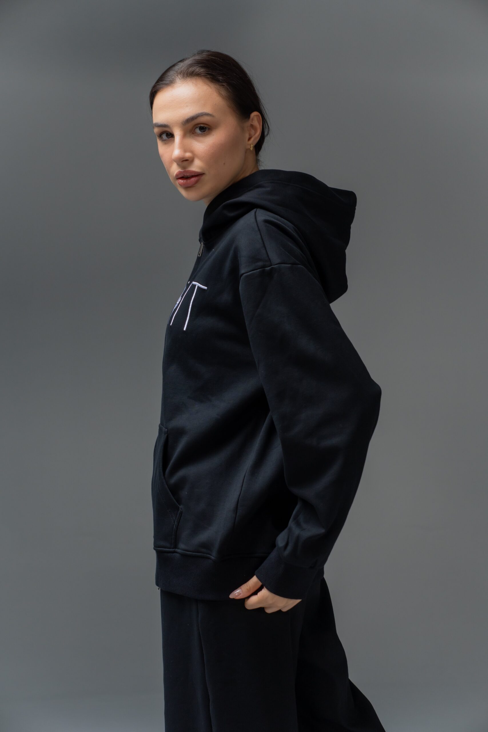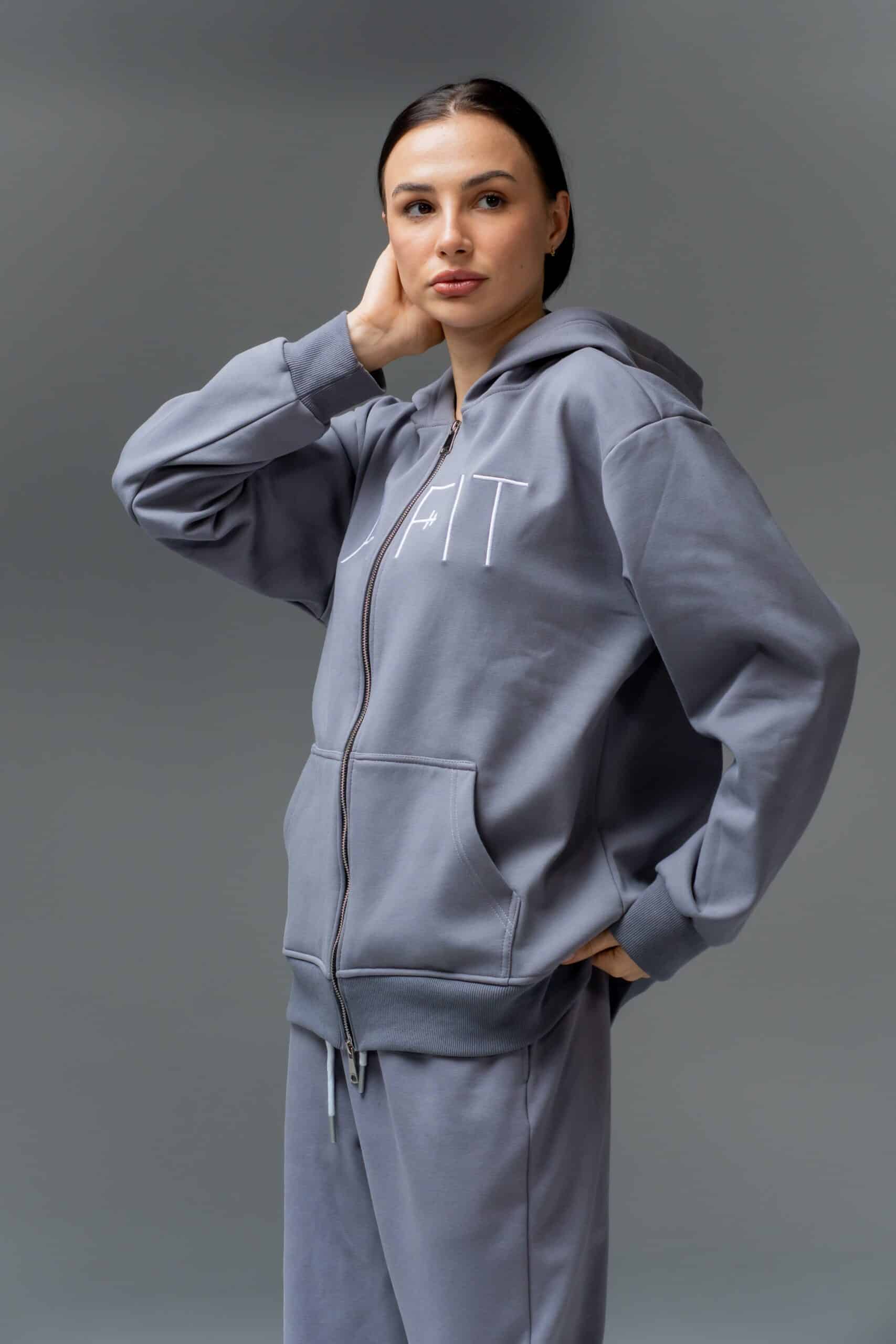 Oversized Zip up hoodie featuring a front metallic zipper, roomy hood, and large front pocket. This hoodie is crafted with a soft and comfortable fabric, making it ideal for casual wear or light workouts.